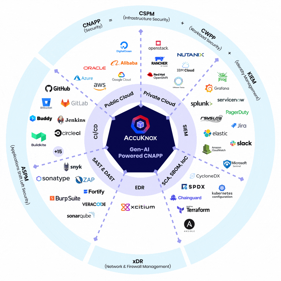 O projeto CNCF OpenSource da AccuKnox, KubeArmor, alcançou 1 milhão + downloads e simplifica a triagem de vulnerabilidades e problemas de fadiga de alertas. Nossa plataforma CNAPP integrada é composta por: